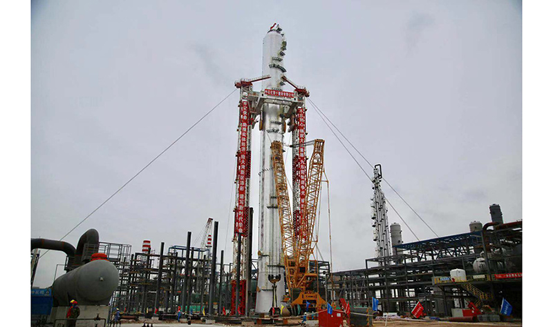 產(chǎn)品分離塔是丙烷脫氫項目的核心設(shè)備之一,用于分離丙烯與丙烷。該設(shè)備采用整體制造、整體運輸、整體吊裝,最大直徑12米、高128米,總重量約3050噸,為國內(nèi)同類產(chǎn)品之最。其吊裝采用國內(nèi)先進的3600噸液壓頂升裝置主吊,運用“液壓同步頂升技術(shù)”將設(shè)備直立、拔高、就位。同時,1250噸級履帶式起重機采用在設(shè)備正后方行走遞送的方法,使設(shè)備由平臥狀態(tài)逐漸過渡到直立狀態(tài),完成設(shè)備整體吊裝就位。