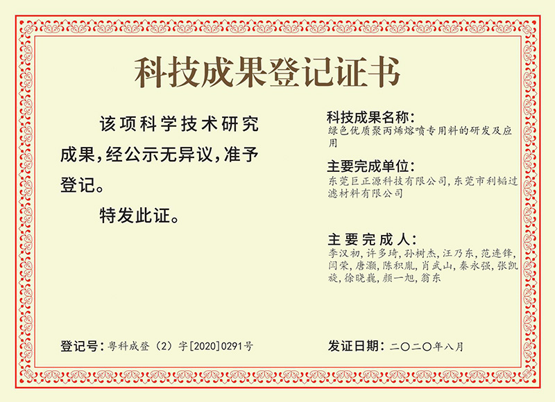 為鞏固提升科研創(chuàng)新水平,4月下旬,巨正源科技公司委托東莞市高新技術(shù)產(chǎn)業(yè)協(xié)會組織專家鑒定委員會對研發(fā)項目“綠色優(yōu)質(zhì)聚丙烯熔噴專用料的研發(fā)及應(yīng)用”進(jìn)行科技成果鑒定,經(jīng)鑒定委員會評審,認(rèn)為項目成果達(dá)到國內(nèi)領(lǐng)先水平,一致同意通過科技成果鑒定。隨后,巨正源科技公司向登記機構(gòu)提出成果登記申請,順利通過了登記審查和社會公示,獲得了科技成果登記證書。